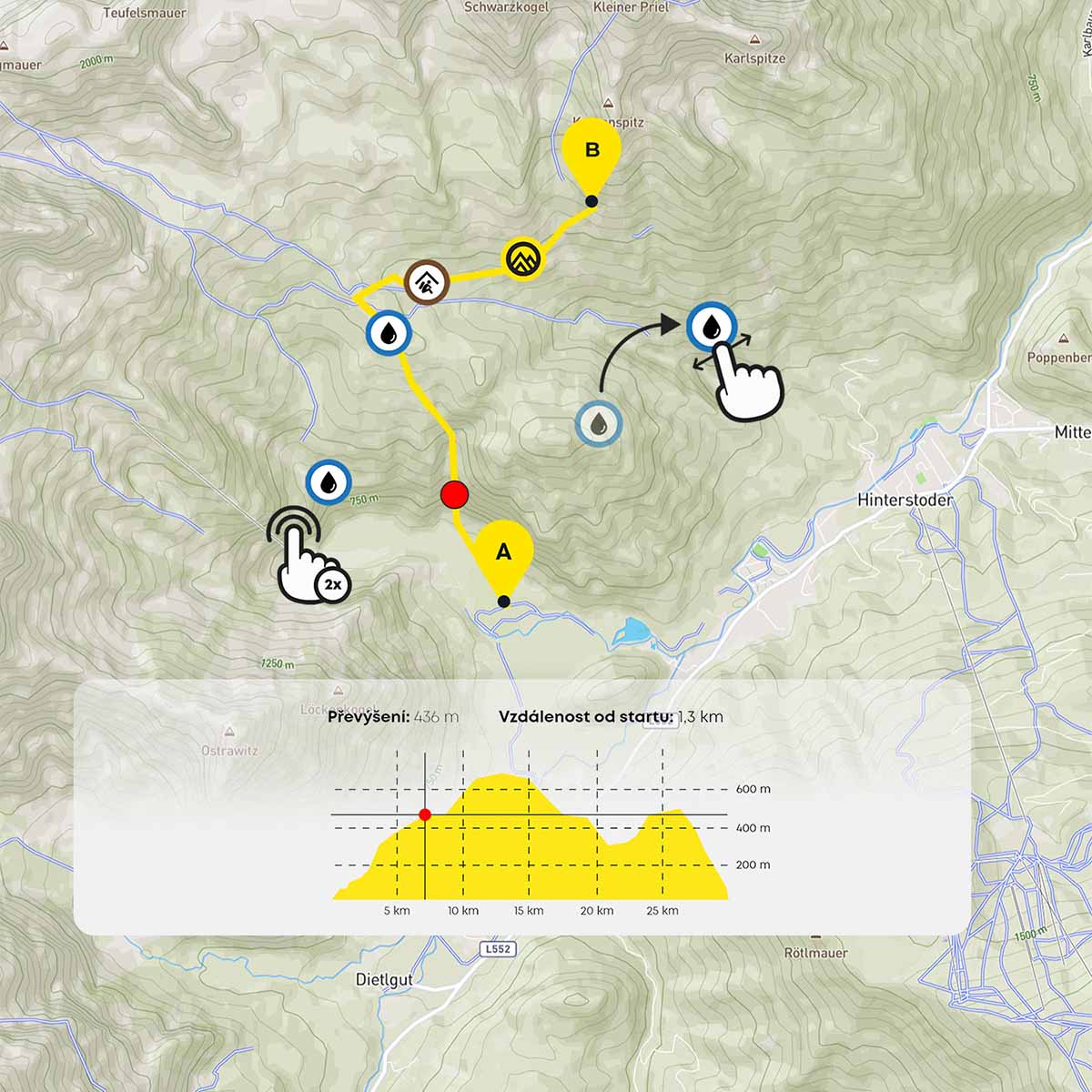 Adventurer app ťa prevedie celým dobrodružstvom, zmeria ti výkon a do mapy sme zaznačili aj všetky dôležité body. Blíži sa dážď? Mrkni sa, kde sú najbližšie prístrešky. Dochádza ti voda? Na mape nájdeš lokáciu pitných zdrojov. Zaujíma ťa, kde na trase sú nejaké pamiatky alebo vyhliadky? Aj na to sme nezabudli!