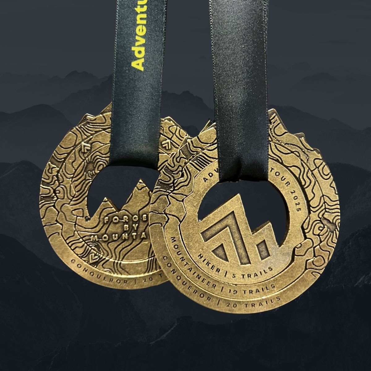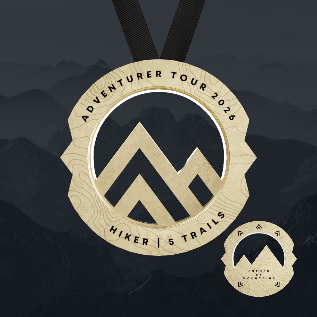 Zadní strana medaile nese vzkaz, který říká vše: FORGED BY MOUNTAINS (Zocelený horami). A zde také najdeš symboly horských vrcholů, které reprezentují zdolané trasy.